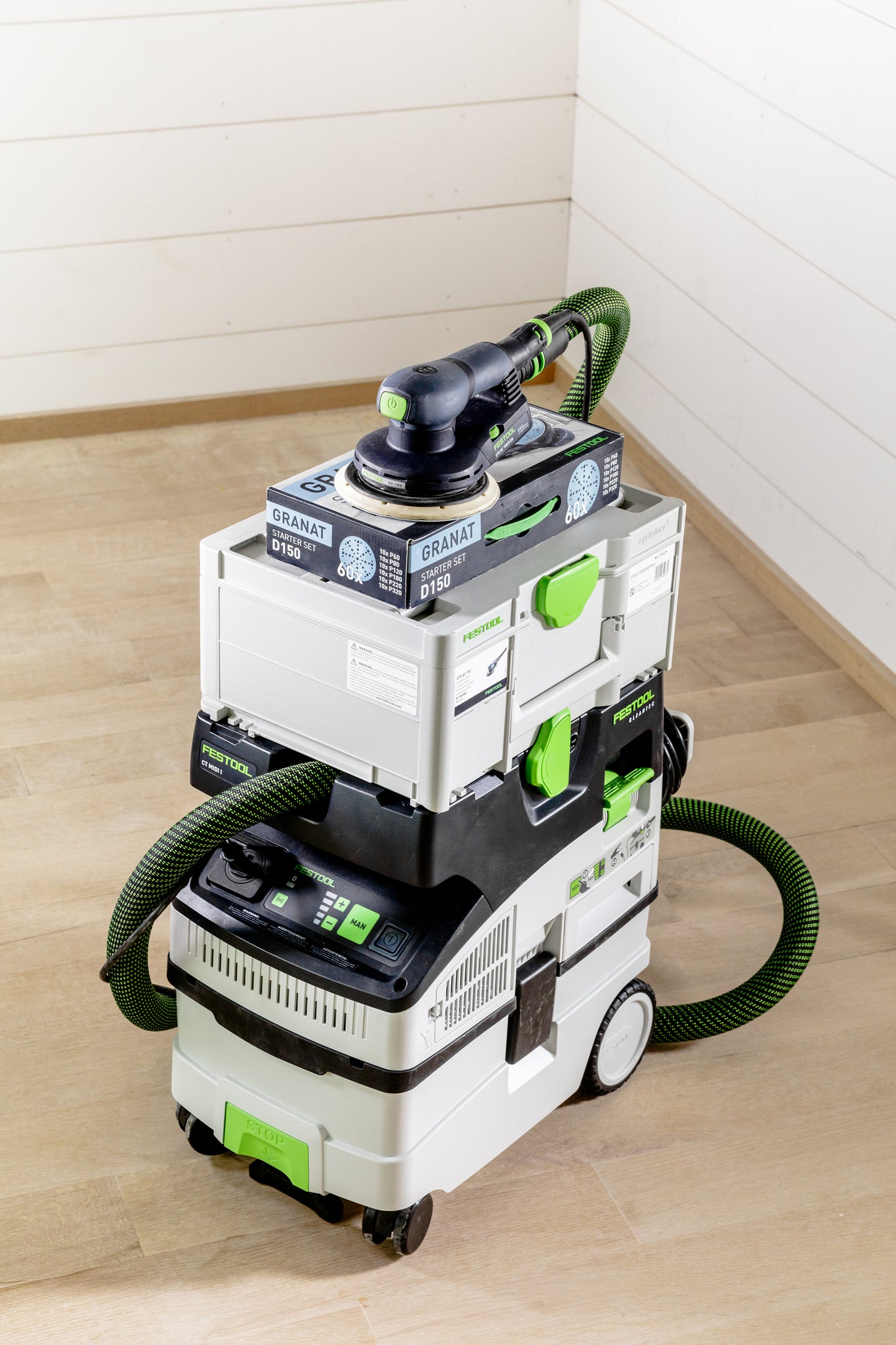Limited Edition Professional Sanding Set featuring the ETS EC 150/5 Random Orbit Sander and the CT MIDI I Dust Extractor. The ETS EC 150/5 offers a larger pad and sanding area, allowing you to cover more surface in less time compared to standard 5" sanders. Its smooth operation and powerful brushless motor are complemented by advanced features such as an integrated sanding pad brake for controlled starts and stops, and active electronic vibration control to reduce fatigue during extended use. This set is paired with the high-performance, feature-rich CT MIDI I HEPA Dust Extractor, equipped with integrated Bluetooth® for automatic activation and seamless pairing with the Festool App. To ensure optimal sanding results, we've included the D150 Granat Starter Set, which provides a premium selection of abrasives in one convenient box—featuring 10 sheets each of P60, P80, P120, P180, P220, and P320 Granat sandpaper. And to round it off, the set includes a box of five replaceable filter bags for the Dust Extractor, keeping your workspace clean and efficient.